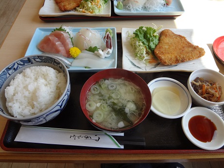 お刺身に、フライ、小鉢にお味噌汁と盛りだくさんで